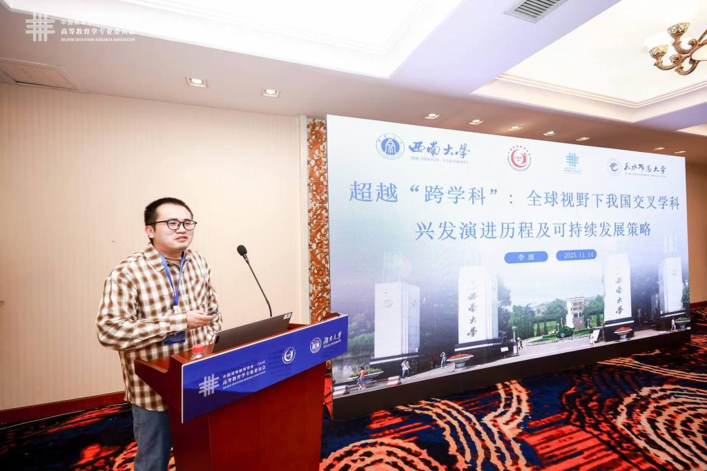 我院青年教师李雄应邀参会,并在高等教育研究博士学术论坛上作题为《超越“跨学科”:全球视野下我国交叉学科兴发演进历程及可持续发展策略》的学术报告。报告梳理了我国交叉学科自20世纪80年代以来的发展历程,将其划分为兴起、停滞和制度化三个阶段,分析了政府、高校与企业在其中的主要角色与现实困境。通过历史与比较研究方法,李雄老师指出,我国交叉学科存在“伪交叉”泛滥、高校创新滞后、制度惯性等问题,并提出应加强全球合作、优化顶层设计、完善政企学协同与评价体系,以推动交叉学科实现由“学科逻辑”向“交叉整合”的转型,迈向可持续的“超学科”发展阶段。