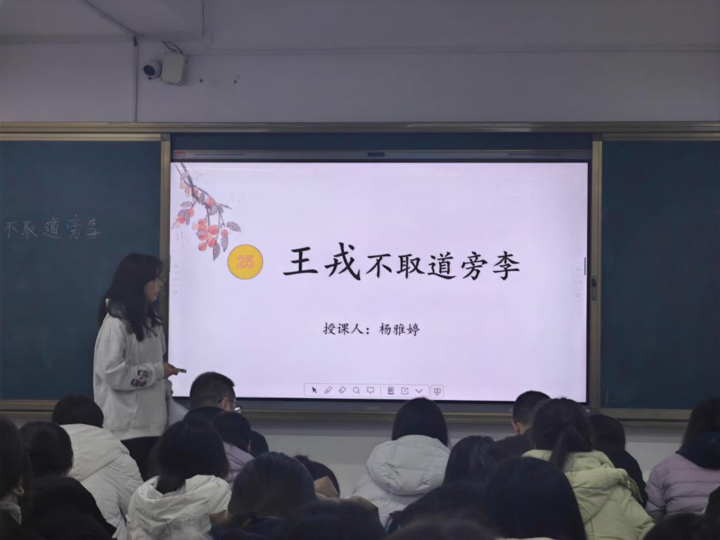 22级小教二班的杨雅婷同学将实习心得总结为“勤听课、听好课、精备课”。她带来的文言文示范课《王戎不取道旁李》,通过情境朗读、角色互动与开放性提问,营造出温暖而富有思辨的课堂氛围,体现了语文教学中的情感浸润与思维激发。
